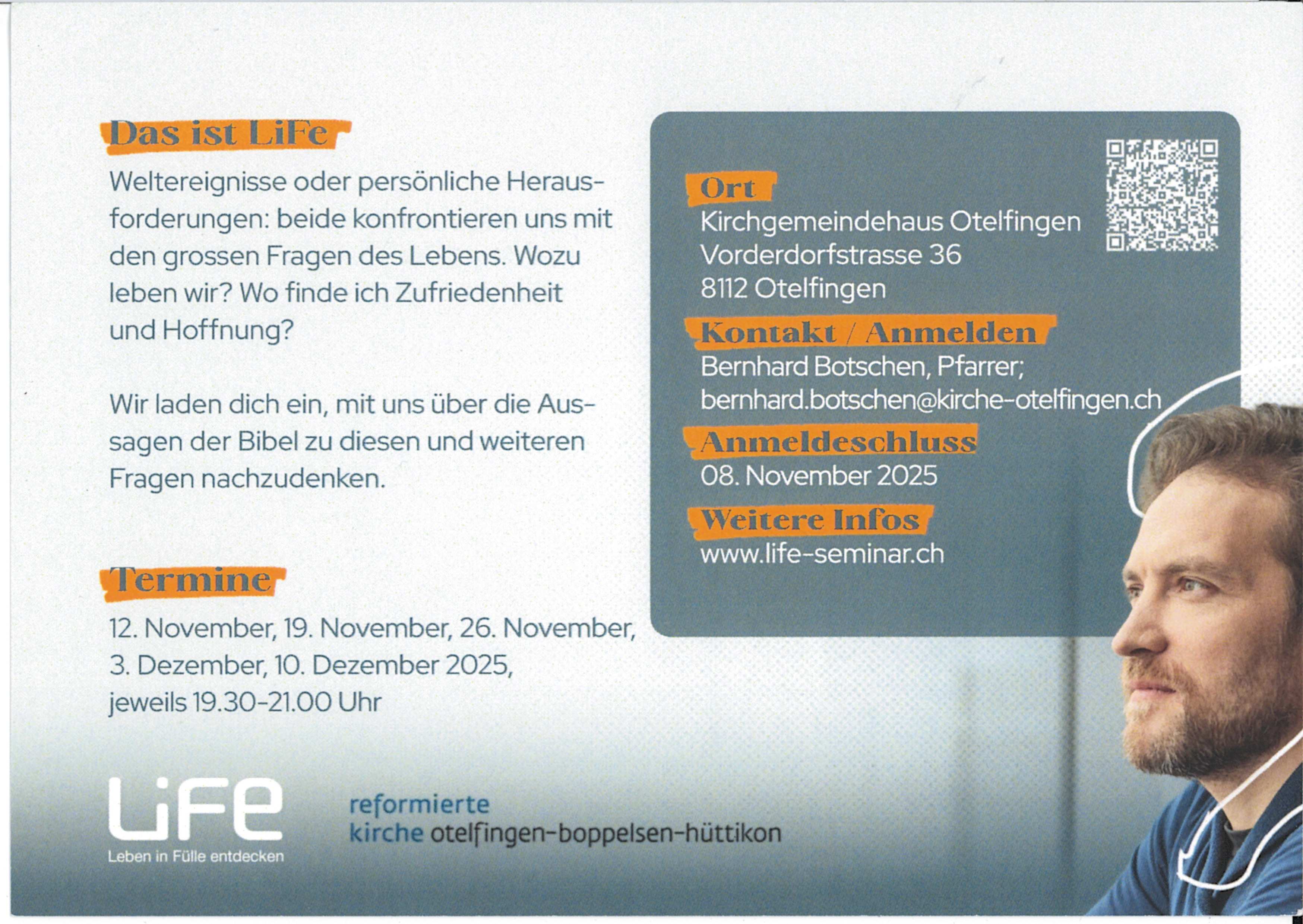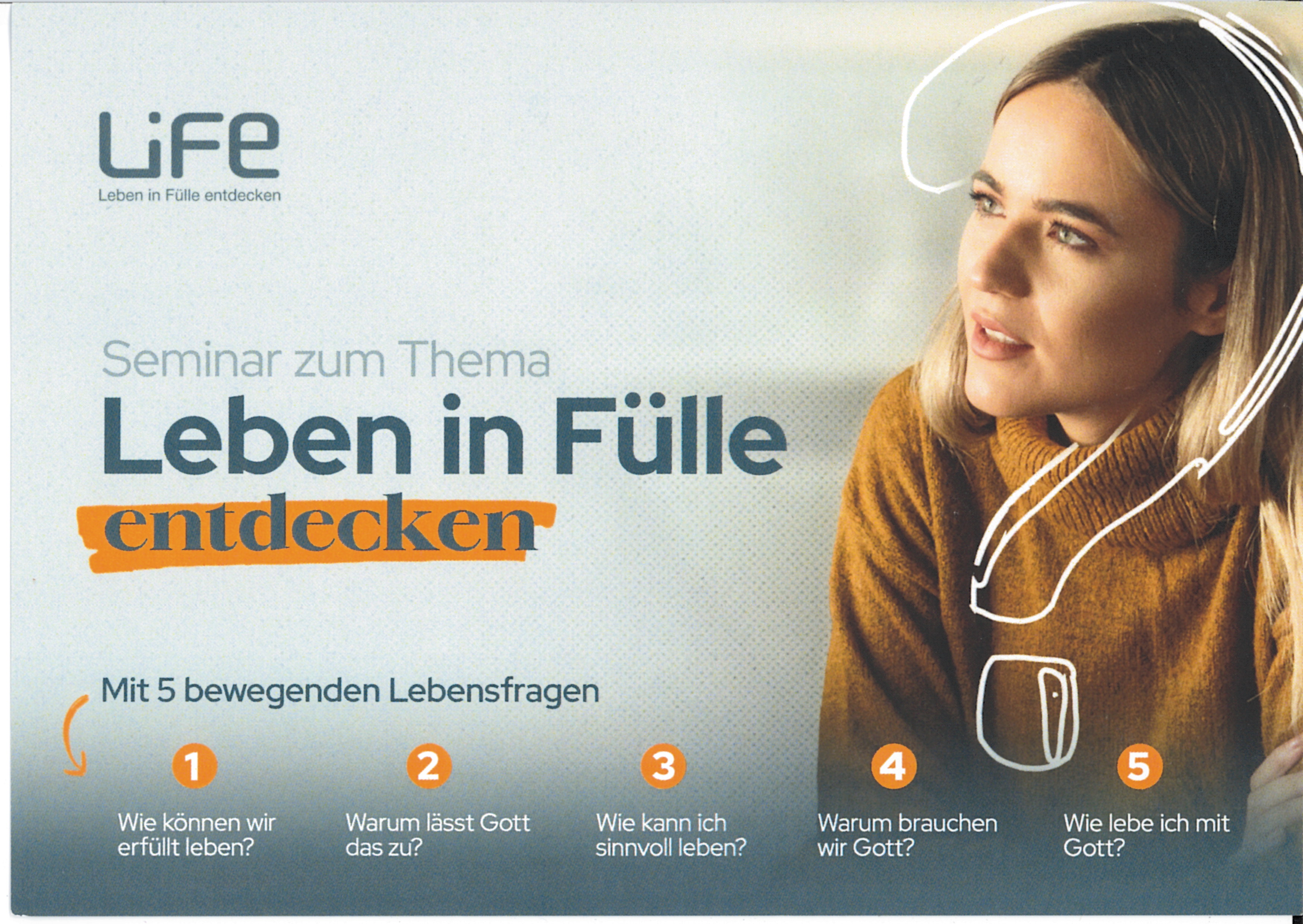 Das Wort "LiFe" steht für eine Aussage von Jesus. Er spricht davon, ein "Leben in Fülle entdecken" zu können, wenn man ihm Platz in seinem Leben gibt. Das LiFe-Seminar umfasst fünf Abende und steht allen offen - gerade auch Menschen, die einmal unverbindlich in das Thema "Gott" hineinschnuppern wollen. Ein erstes Mal wird es an fünf Mittwoch Abenden ab 12.November 2025 durchgeführt.